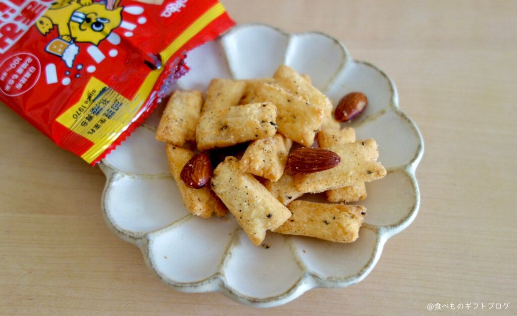 ペッパーベーコン味のおかきと素焼きされたアーモンドが入っていました。